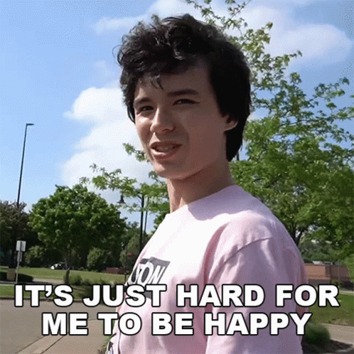 A young man, Lofe, in a pink shirt, expresses 'It's just hard for me to be happy' outdoors.