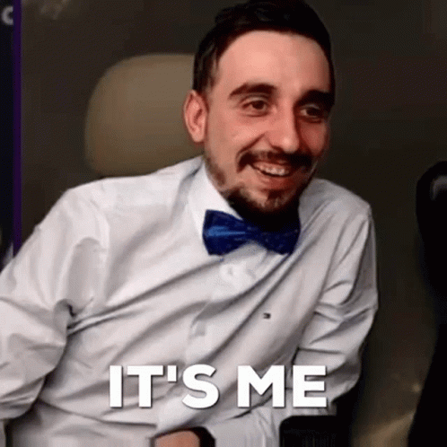 Andrea Mengucci smiles, waves, and gives a thumbs up, declaring 'It's Me!' in a white shirt and blue bow tie.