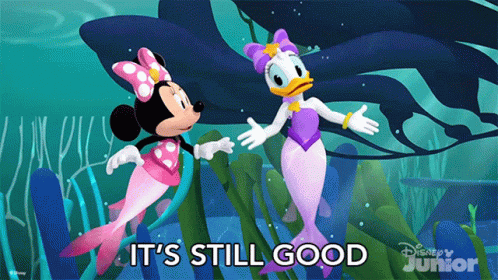 Minnie Mouse and Daisy Duck as mermaids underwater, with the caption 'It's Still Good'.