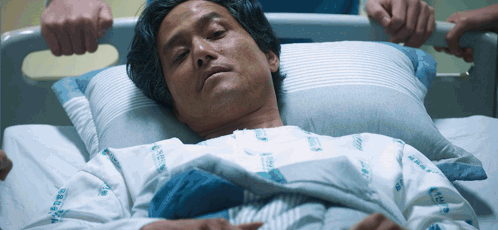 a man is laying in a hospital bed with a pillow that says ' korean ' on it