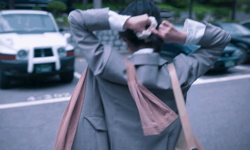a woman adjusts her hair while walking down the street
