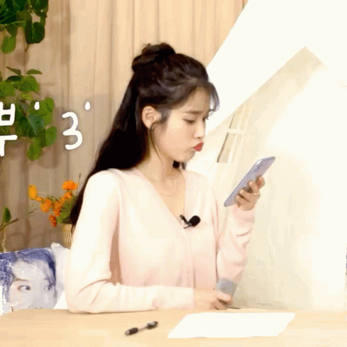 IU reacts to something on her phone with a cute pout, showcasing her half-up bun hairstyle.