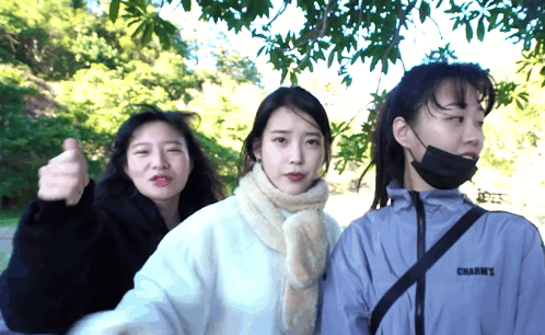 a woman wearing a mask and a jacket that says charmy