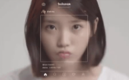 K-pop star IU pouts playfully while an Instagram-like filter adds cute cartoon eyes and floating hearts.
