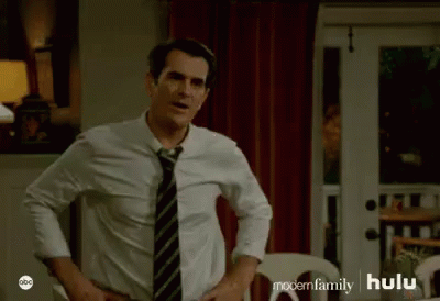 A man from Modern Family excitedly celebrates with the text 'Iupi' overlaid on the screen.