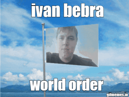 A flag featuring Ivan Bebra's face and the text 'world order' waves against a blue sky.
