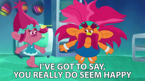 Poppy tells King Peppy, 'I've got to say, you really do seem happy,' in a scene from Trolls: The Beat Goes On.