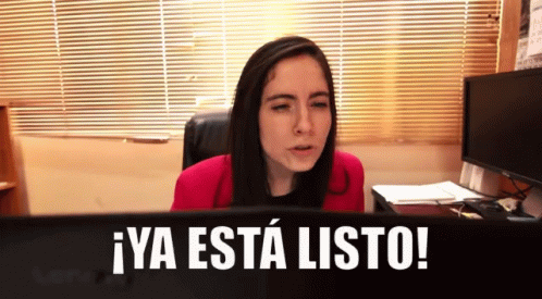 Iviiween, an office worker, excitedly announces her work is ready, sitting at her desk with a monitor displaying '¡YA ESTÁ LISTO!'