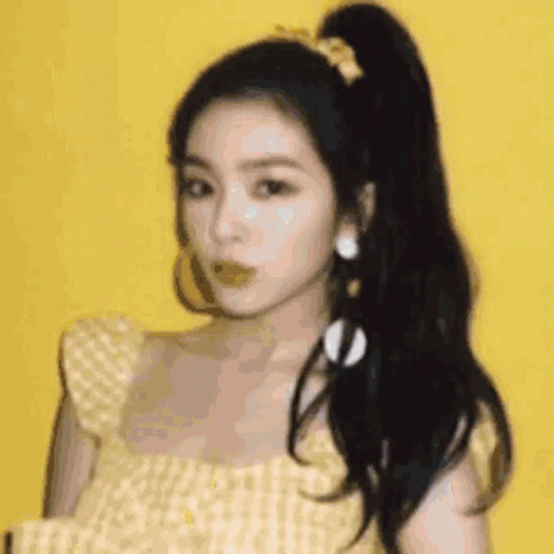 Irene Red Velvet, also known as Ivpsxia, in a playful yellow outfit, making a kissing face with heart sunglasses.
