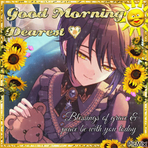Izuyuyu White from Mahoyaku shares a 'Good Morning Dearest' message, holding a teddy bear amidst sunflowers.