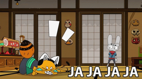 Animated cat Akai and a rabbit in a Japanese-style room, with Akai laughing hysterically as "JA JA JA JA" text appears.