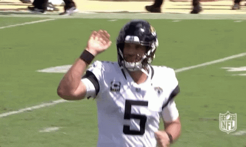 Blake Bortles of the Jacksonville Jaguars high-fives a teammate after a play, celebrating on the field.