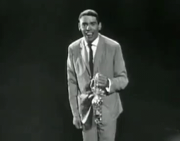 Jacques Brel singing and smiling on stage, holding a saxophone in a black and white performance.