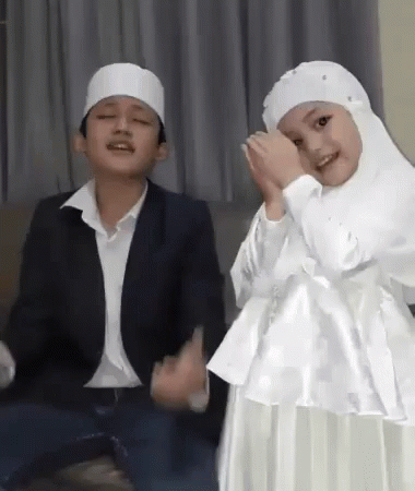 Two children, a boy and a girl, dressed in Islamic attire, singing and making gestures to the song "Jadilah Anak Soleh Dan Solehah".