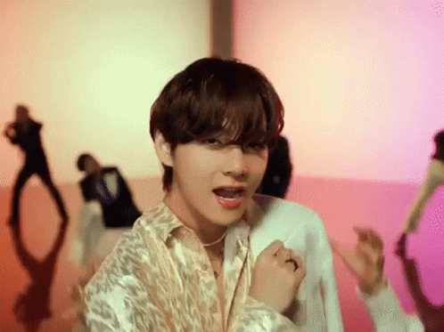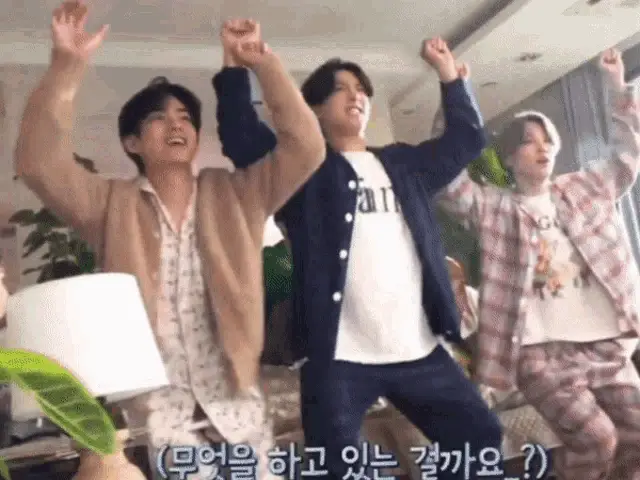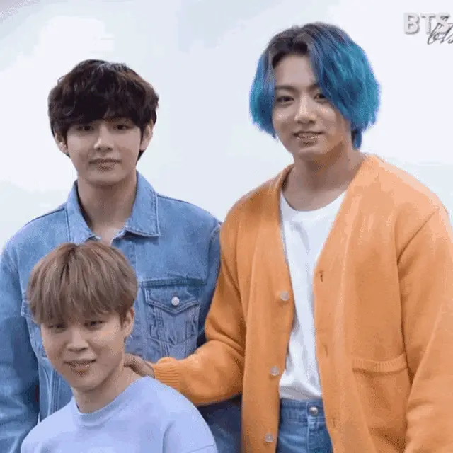 BTS members V, Jimin, and Jungkook posing and singing together in a vibrant, colorful setting.