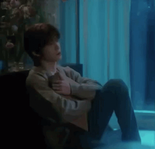 NCT's Jaehyun sits in a pensive moment, hugging himself in a dimly lit room with a blue hue.