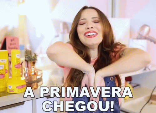 Taciele Alcolea joyfully celebrates the arrival of spring with arms outstretched, text reads 'A Primavera Chegou!'