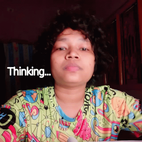 Jagyasini Singh looking up, lost in thought, wearing a colorful patterned shirt with 'Thinking...' text on screen.