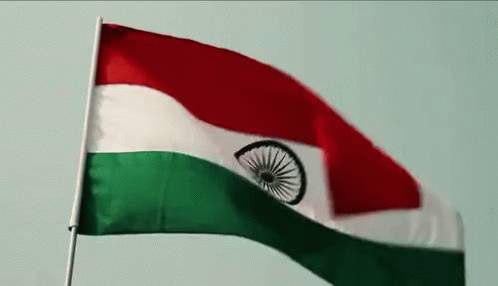 The vibrant Indian national flag, with its saffron, white, and green stripes and Ashoka Chakra, waves proudly against a clear sky.