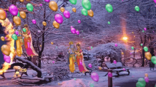 Animated depiction of Lord Rama, Sita, Lord Shiva, and Parvati in a snowy park with floating balloons and fiery rings.