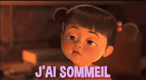 Adorable Boo from Monsters Inc. looks tired and says 'J'ai sommeil' (I'm sleepy) in this cute animated moment.