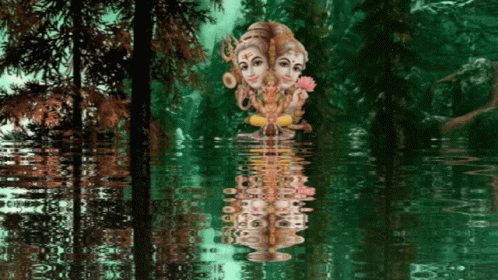 A stylized depiction of the Jaish Krishna deity is reflected in serene water amidst a forest.
