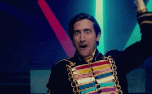 Jake Gyllenhaal as Mr. Music, wearing a colorful jacket and making a crazy, wide-eyed expression.