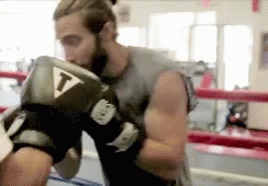 Jake Gyllenhaal intensely training in a boxing ring, wearing gloves, preparing for his role in Southpaw.