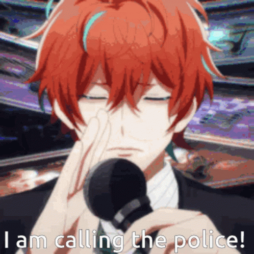 Doppo Kannonzaka holds a microphone, declaring 'I am calling the police!' before dialing a phone.