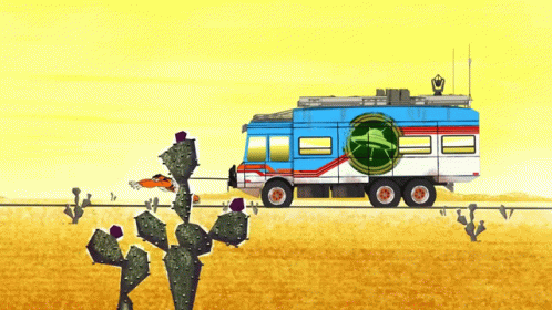 Ben 10 character Ralph pulls a large RV through a vast desert landscape with cacti.