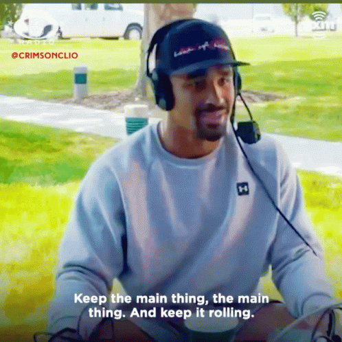 Jalen Hurts, wearing headphones and a hat, shares his philosophy: 'Keep the main thing, the main thing. And keep it rolling.'