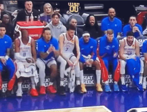 Jalen Williams, Chet Holmgren, and Jaylin Williams perform a synchronized celebration on the basketball bench.