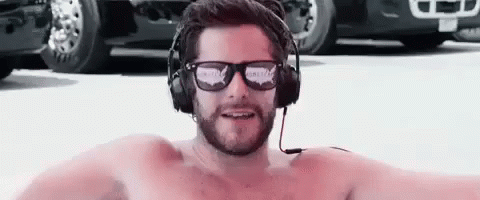 A shirtless man with a beard, wearing headphones and sunglasses, relaxing.