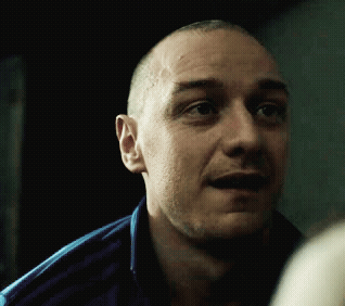 James McAvoy, with a shaved head, shows a relieved and satisfied smile in a scene from the movie Split.