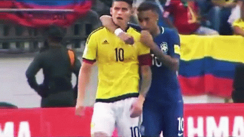 Football stars James Rodríguez and Neymar Junior share a moment of bromance on the field during a match.