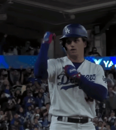 Dodgers player James Outman celebrates on the field, pumping his fists in his uniform.