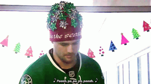 Jamie Benn, wearing a festive Christmas hat and Dallas Stars jersey, sings 'Paaah Pa Pa Pa Paaah'.