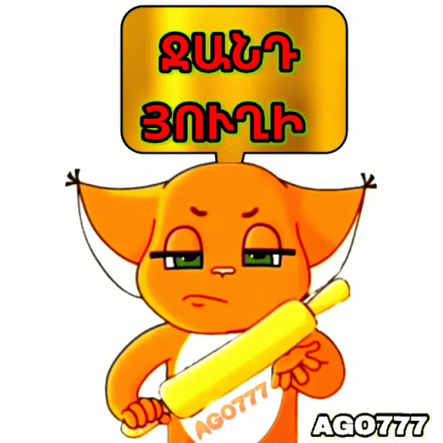 Grumpy orange cartoon cat holds a yellow rolling pin, branded with 'AGO777', looking annoyed.