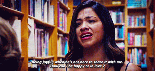 Jane Villanueva (Gina Rodriguez) cries in a library, questioning how she can be happy or in love without him.