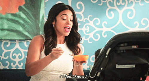 Jane Villanueva from Jane The Virgin feeding a baby and saying 'I don't know'.