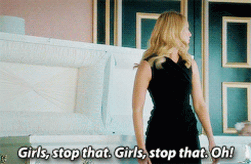 a woman in a black dress is standing in front of a coffin and says " girls stop that girls stop that oh "