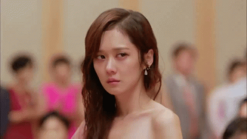 Jang Nara from Fated To Love You, looking serious in a strapless outfit before a crowd.