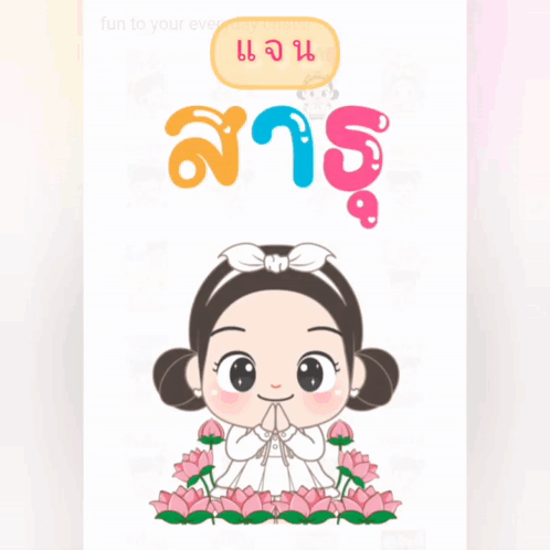 A cute cartoon girl with a traditional Thai 'wai' gesture, surrounded by lotus flowers, featuring 'Jan' and 'Sathu' text.