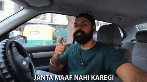 Jasminder Singh in a car, pointing, with the phrase 'Janta Maaf Nahi Karegi' (The public will not forgive).