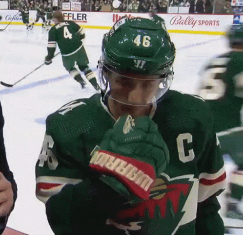 Jared Spurgeon, captain of the Minnesota Wild, deep in thought on the ice during a hockey game.