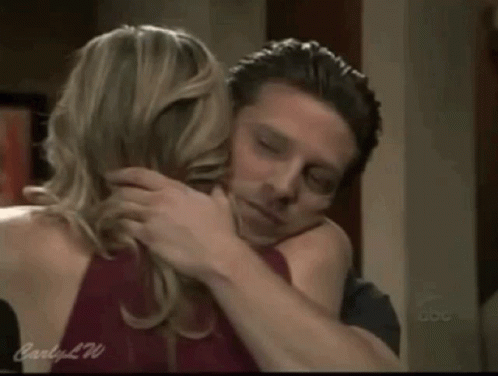 Jason Morgan and Carly share an emotional hug in a dimly lit room, a moment of intense connection.