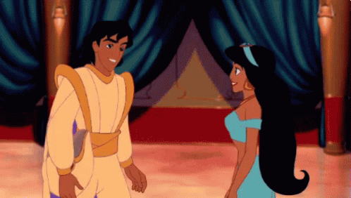 Aladdin and Princess Jasmine share a tender, loving embrace in a romantic animated scene.