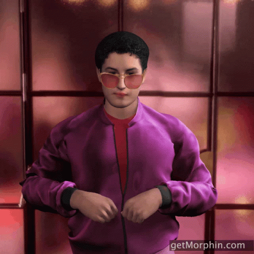 Jason Biggs, resembling his American Pie character, celebrates with confetti, wearing sunglasses and a purple jacket.