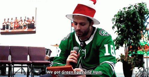 Jason Dickinson, wearing a Cat in the Hat hat and Dallas Stars jersey, reads 'Green Eggs and Ham'.