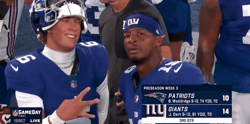 Jaxson Dart and Jameis Winston share a funny moment on the New York Giants sideline during a game.